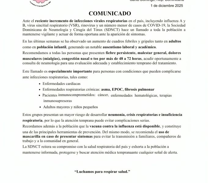 Santo Domingo. – La Sociedad Dominicana de Neumología y Cirugía de Tórax (SDNCT) alertó sobre la necesidad urgente de garantizar el acceso...
