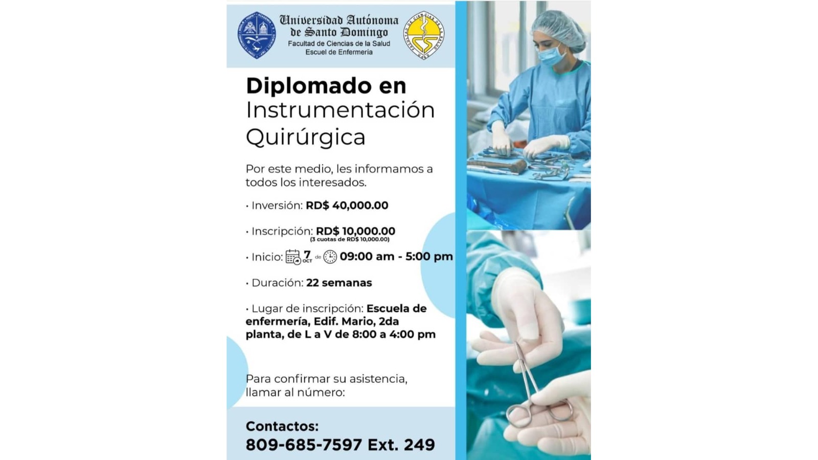La Escuela de Enfermería de la Facultad de Ciencias de la Salud de la Universidad Autónoma de Santo Domingo (UASD), anunció el Diplomado en Instrumentación Quirúrgica.