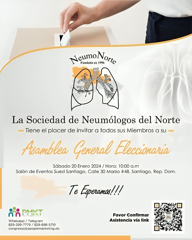 Santo Domingo. – La Sociedad de Neumólogos del Norte (NEUMONORTE), a través de su cuenta oficial de Instagram @neumonorte invita a todos sus miembros a participar en lo que será su Asamblea General Eleccionaria.