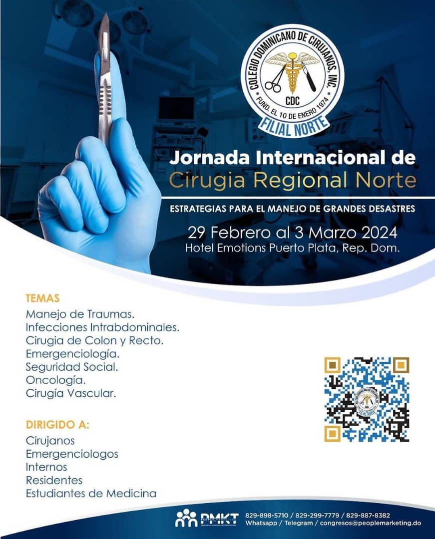 Santo Domingo. – El Colegio Dominicano de Cirujanos (CDC), invita a toda la comunidad a participar en lo que será su Jornada Internacional de Cirugía Regional Norte, donde abordarán estrategias para el manejo de grandes desastres.