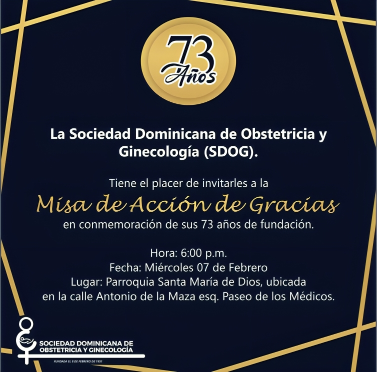 Santo Domingo.- Con el fin de celebrar su aniversario número 73, la Sociedad Dominicana de Obstetricia y Ginecología (SDOG), invita a la Misa de Acción de Gracias.