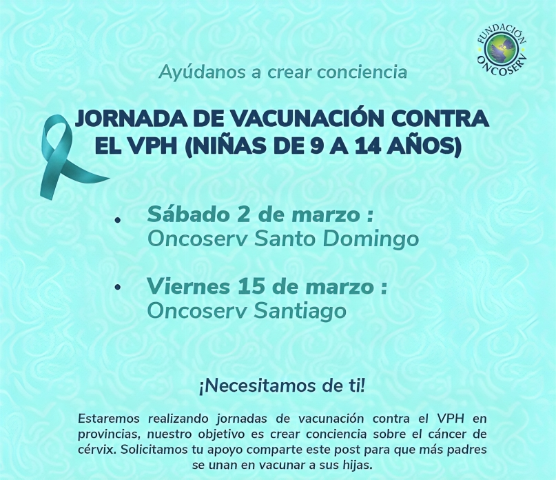 Santo Domingo.- La Fundación Oncoserv, anunció la Jornada de Vacunación contra el VPH (para niñas de 9 a 12 años de edad).