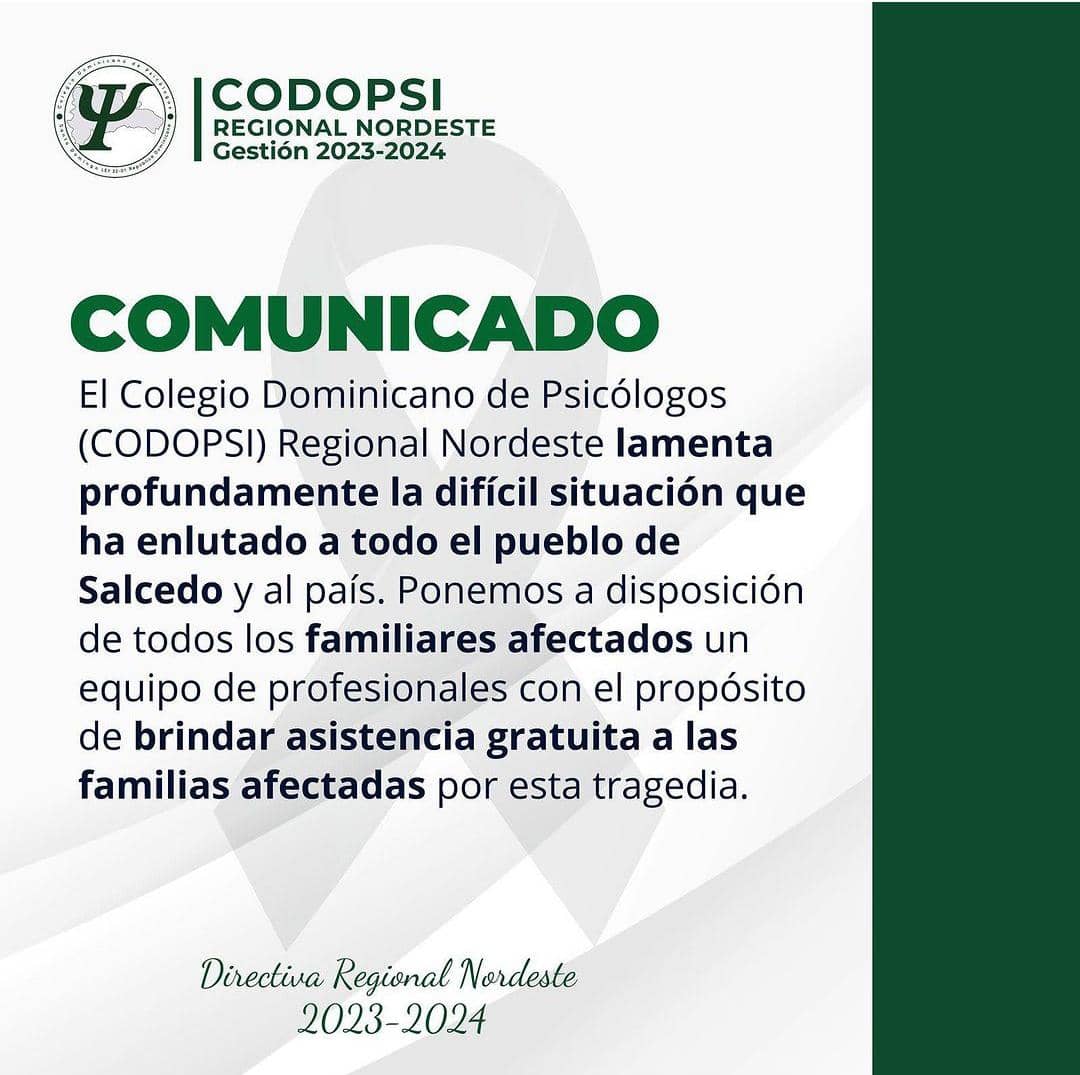 Santo Domingo.- Con el propósito de brindar asistencia a las familias de Salcedo por los recientes acontecimientos, el Colegio Dominicano de Psicólogos (CODOPSI), Regional Nordeste, pone a disposición un grupo de profesionales de la entidad.