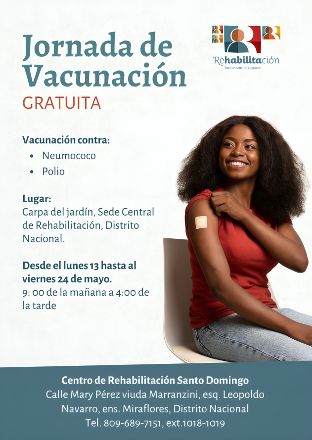 Santo Domingo. – Como parte del compromiso institucional con la prevención de enfermedades discapacitantes y el cuidado de la salud pública, Rehabilitación convoca a participar en la jornada gratuita de vacunación contra neumococo y el polio en la sede de Santo Domingo, ubicada en la calle Mary Pérez Marranzini esquina Leopoldo Navarro ensanche Miraflores.