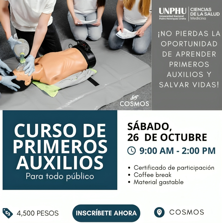 Santo Domingo.- La Junta Asesora Estudiantil de la Escuela de Medicina de la Universidad Nacional Pedro Henríquez Ureña (JAEMED-UNPHU), invita a participar en el Curso de Primeros Auxilios.