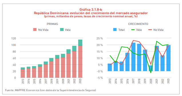 Santo Domingo. – El mercado asegurador dominicano registró un crecimiento significativo del 14,3% en 2023, consolidando su posición como uno de los principales impulsores del sector en la región. Así lo destacó el reciente informe “El Mercado Asegurador Latinoamericano en 2023”, elaborado por MAPFRE Economics, Servicio de Estudios de MAPFRE que analiza el desempeño de una región en la que la aseguradora lidera el negocio de No Vida y es el mayor grupo multinacional. El estudio fue presentado este martes 22 de octubre del 2024 al mercado latinoamericano.