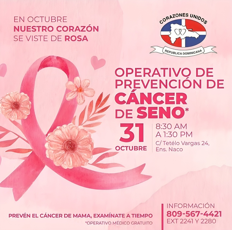Santo Domingo. – En conmemoración al Mes de la Lucha Contra el Cáncer de Mama, la Fundación Corazones Unidos, invita a participar en el Operativo de Prevención de Cáncer de Seno.