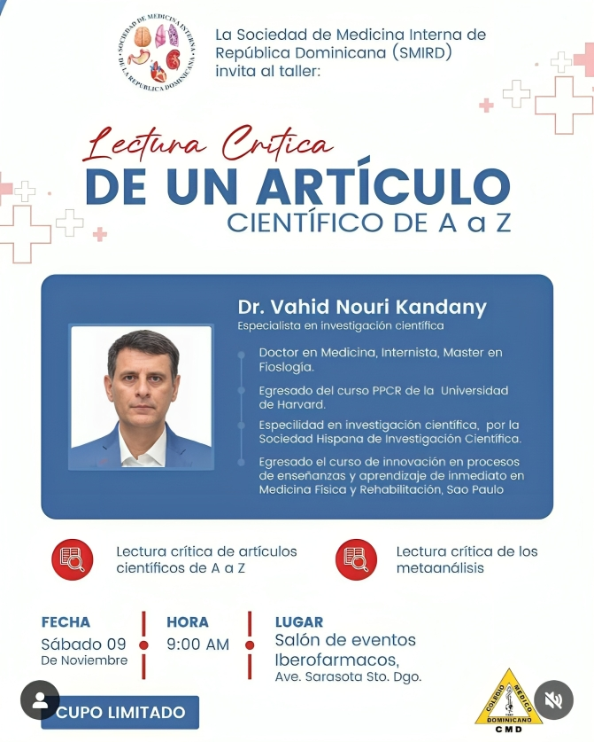 El taller, será impartido por el Dr. Vahid Nouri Kandany, destacado médico internista y especialista en investigación científica, quien compartirá su experiencia y conocimientos para ayudar a los participantes a desarrollar un enfoque crítico en la lectura de artículos científicos.