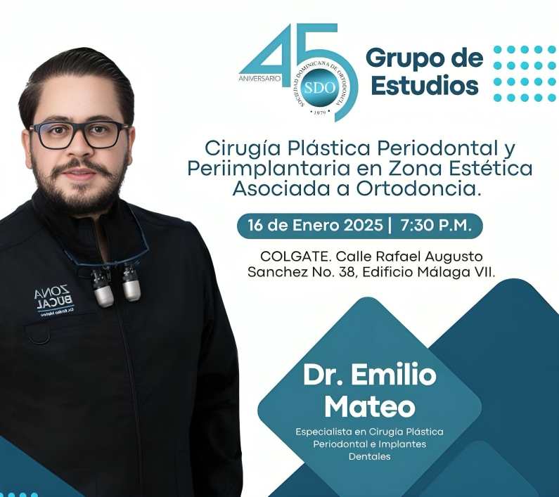 El segundo evento, consistirá en una conferencia presencial sobre “Cirugía plástica periodontal y periimplantaria en zonas estéticas asociada a ortodoncia”, a cargo del doctor Emilio Mateo, experto en cirugía plástica periodontal e implantes dentales. Esta conferencia se llevará a cabo este jueves 16 de enero a las 7:30 p.m. en Colgate, ubicado en la calle Rafael Augusto Sánchez No. 38, edificio Málaga VII.