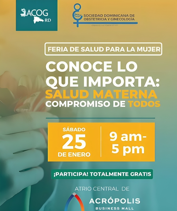 Santo Domingo. – La Sociedad Dominicana de Obstetricia y Ginecología (SDOG) invita a toda la comunidad a la Feria de Salud para la Mujer, un evento diseñado para concienciar y educar sobre la salud materna. Esta actividad, que se llevará a cabo en colaboración con ACOG RD, se realizará el sábado 25 de enero, de 9:00 de la mañana a 5:00 de la tarde, en el Atrio Central de Acrópolis Business Mall.