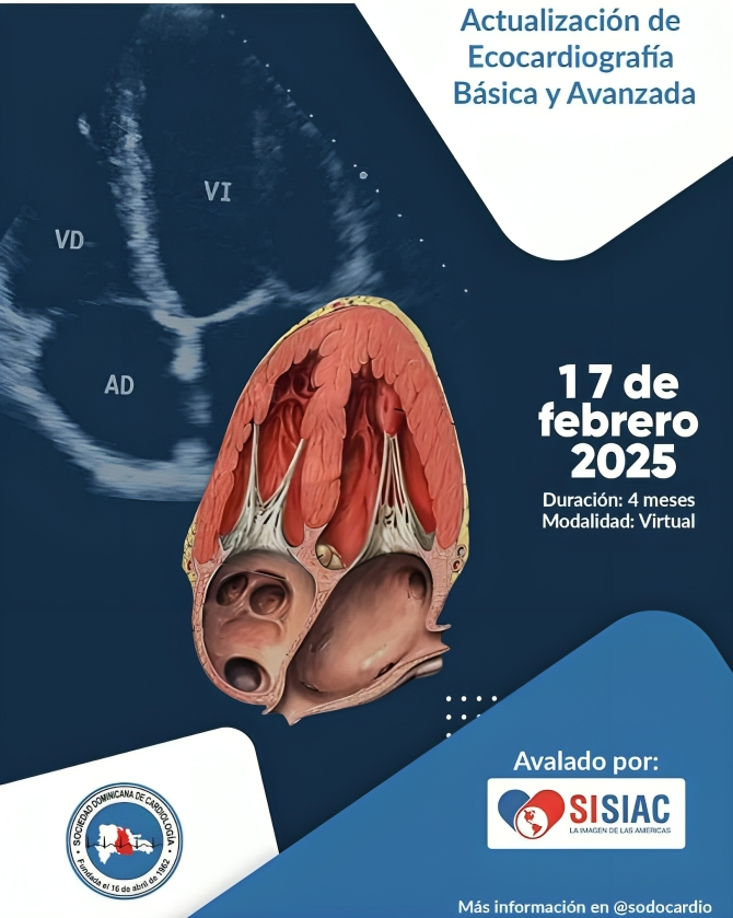 Santo Domingo. – La Sociedad Dominicana de Cardiología (SODOCARDIO) se complace en anunciar el inicio de su Curso de Actualización en Ecocardiografía Básica y Avanzada, que dará comienzo el próximo lunes 17 de febrero. Esta actividad tendrá una duración de 4 meses y se llevará a cabo en modalidad virtual.