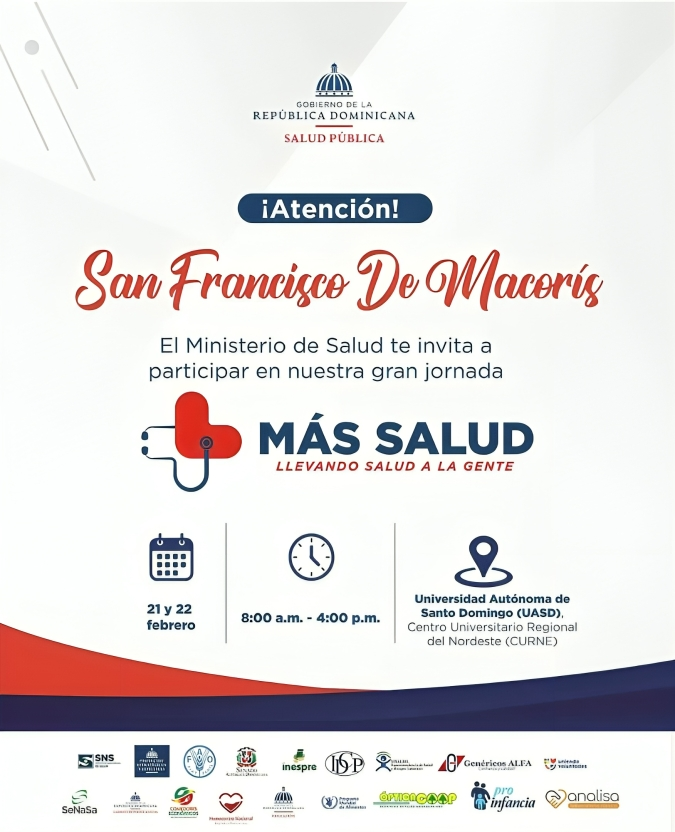 Santo Domingo. – El Ministerio de Salud Pública tiene el placer de invitar a toda la comunidad a participar en la jornada «Más Salud y Bienestar», un evento que ofrecerá atención médica gratuita para todos los ciudadanos. Esta importante actividad se llevará a cabo en San Francisco de Macorís los días 21 y 22 de febrero, de 8:00 de la mañana a 4:00 de la tarde, en la Universidad Autónoma de Santo Domingo (UASD), CURNE, con el objetivo de promover la salud y el bienestar de la población, así como facilitar el acceso a servicios médicos esenciales.
