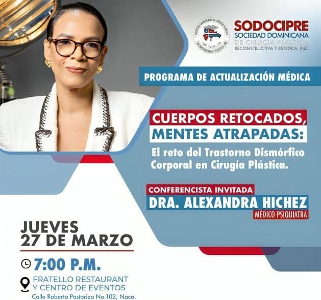 La actividad contará con la participación de la reconocida Dra. Alexandra Hichez, médico psiquiatra, quien será la conferencista invitada y abordará el impacto del Trastorno Dismórfico Corporal en el contexto de la cirugía plástica. Asimismo, los doctores José Mora, Dorian García y Argenis Sánchez, destacados miembros de SODOCIPRE, también compartirán sus conocimientos y experiencias en este importante tema.