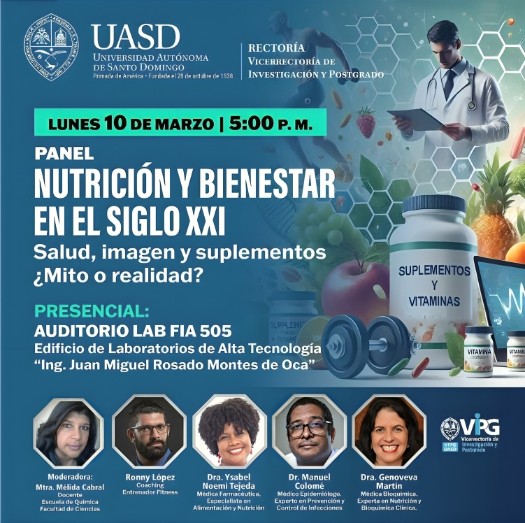 Santo Domingo. – La Universidad Autónoma de Santo Domingo (UASD) invita a participar en el panel titulado «Nutrición y Bienestar en el Siglo XXI: Salud, Imagen y Suplementos, ¡Mito o Realidad?», que se llevará a cabo hoy lunes 10 de marzo a las 5:00 de la tarde.