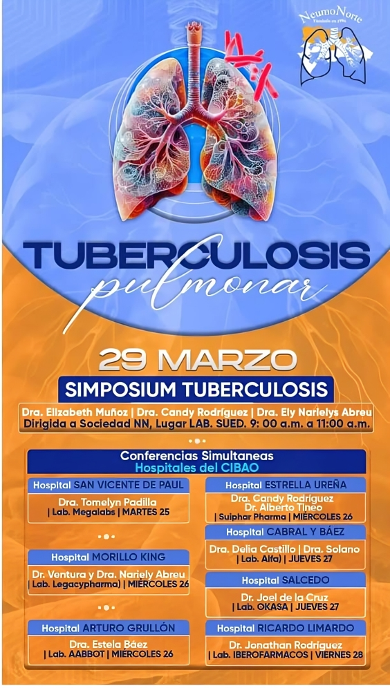 Santo Domingo. – La Sociedad de Neumólogos del Norte (NEUMONORTE) se complace en anunciar una serie de actividades educativas en conmemoración al Día Mundial de la Lucha contra la Tuberculosis Pulmonar, que se llevará a cabo del 25 al 29 de marzo en los distintos hospitales del Cibao.