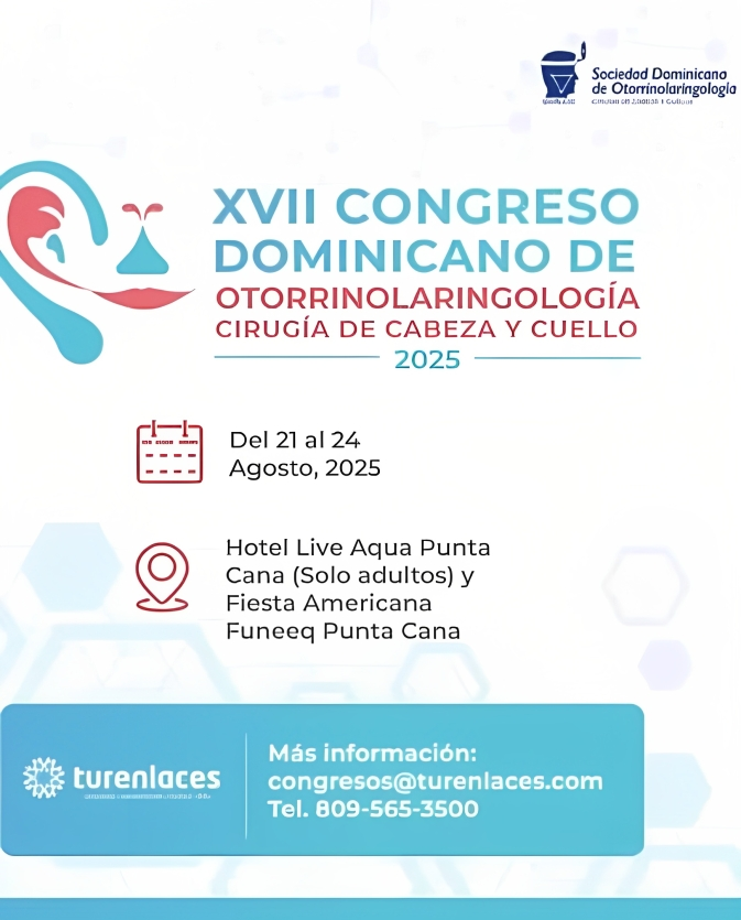 Santo Domingo. – La Sociedad Dominicana de Otorrinolaringología Cirugía de Cabeza y Cuello se complace en anunciar la celebración de su XVII Congreso Dominicano, que se llevará a cabo del 21 al 24 de agosto de 2025, en dos prestigiosos hoteles de Punta Cana: el Hotel Live Aqua (solo adultos) y el Fiesta Americana Funeeq (hotel familiar).