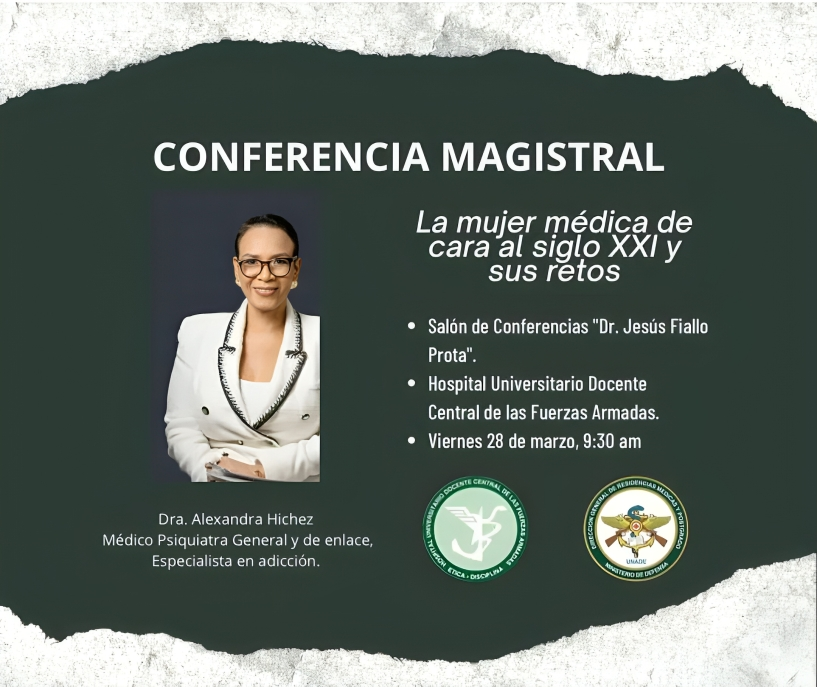 La conferencia contará con la participación de la Dra. Alexandra Hichez, destacada Médico Psiquiatra General y de Enlace, especializada en adicciones, quien compartirá su experiencia y perspectivas sobre los desafíos y oportunidades que enfrentan las mujeres en el ámbito médico en la actualidad.