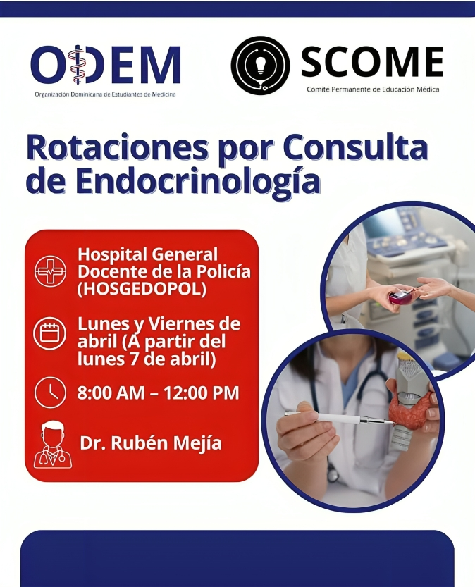 Santo Domingo. – La Organización Dominicana de Estudiantes de Medicina (ODEM) invita a los estudiantes interesados a participar en las rotaciones por consulta de endocrinología en el Hospital General Docente de la Policía (HOSGEDOPOL), bajo la tutoría del Dr. Rubén Mejía. Esta actividad representa una valiosa oportunidad para aprender a partir de casos clínicos reales, profundizando en el diagnóstico y tratamiento de diversas patologías endocrinas.