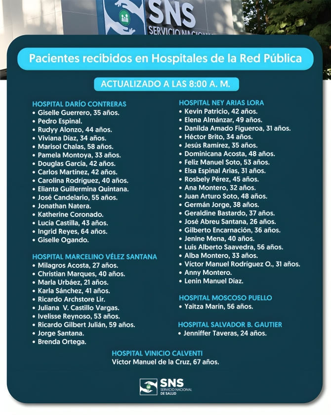 Santo Domingo. – Durante la madrugada de este martes, los hospitales de la Red Pública pertenecientes al Servicio Nacional de Salud (SNS) recibieron atención médica a un total de 50 personas que resultaron lesionadas tras el colapso del techo de un establecimiento de entretenimiento en la capital. Hasta las ocho de la mañana, seis centros hospitalarios reportaban pacientes atendidos: los traumatológicos Ney Arias Lora y Darío Contreras, junto con los hospitales Moscoso Puello, Marcelino Vélez Santana, Vinicio Calventi y Salvador B. Gautier.