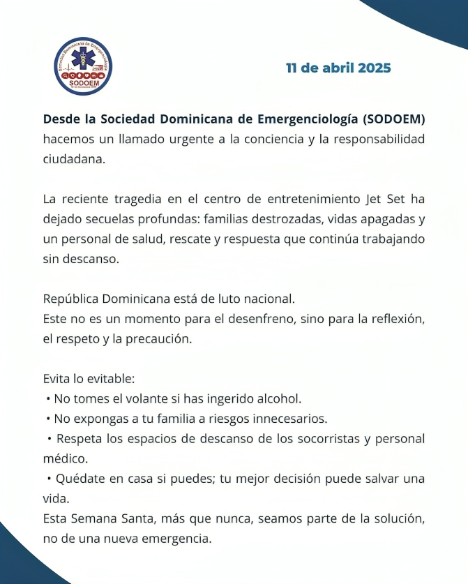 Santo Domingo. – Ante el próximo asueto de Semana Santa, la Sociedad Dominicana de Emergenciología (SODOEM) hizo un llamado a la ciudadanía para actuar con conciencia y responsabilidad, evitando conductas que puedan generar nuevas emergencias tras la reciente tragedia en el centro de entretenimiento Jet Set.