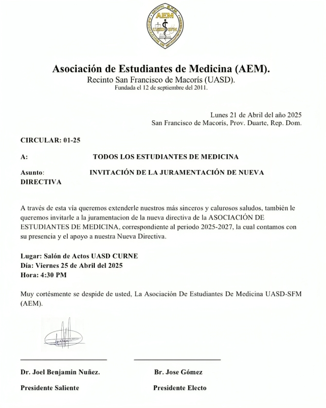 San Francisco de Macorís. – La Asociación de Estudiantes de Medicina de la UASD recinto San Francisco de Macorís (AEM UASD-SFM) extiende una cordial invitación a la comunidad universitaria y público en general para participar en el acto de juramentación de su nueva directiva, que estará al frente de la organización durante el período 2025-2027. Este evento marca un hito importante en la vida institucional de los futuros médicos.