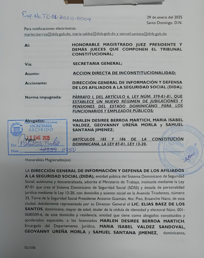 Santo Domingo. – La Dirección General de Información y Defensa de los Afiliados a la Seguridad Social (DIDA) interpuso una acción directa de inconstitucionalidad ante el Tribunal Constitucional contra el párrafo I del artículo 6 de la Ley 379-81, que regula el régimen de pensiones del Estado dominicano. Con esta medida, la institución busca garantizar el derecho a pensión de los familiares de pensionados y jubilados fallecidos a quienes se les ha negado este beneficio.