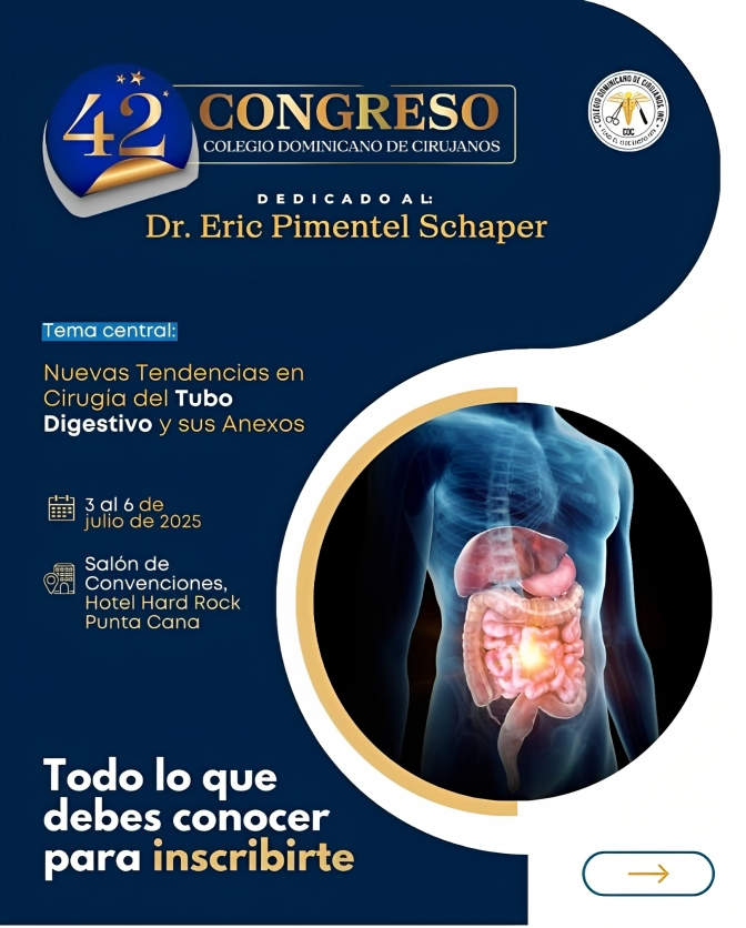 Santo Domingo. – El Colegio Dominicano de Cirujanos (CDC) se complace en anunciar la celebración de su 42º Congreso Anual, que en esta ocasión rendirá homenaje al destacado Dr. Eric Pimentel Schaper, reconocido por su ejemplar liderazgo, ética profesional y valiosos aportes al desarrollo de la cirugía tanto a nivel nacional como internacional.