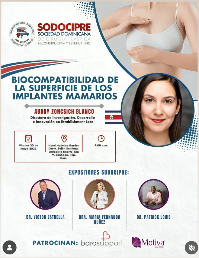 Este importante evento académico contará con la distinguida participación de Audry Zoncsich Blanco, Directora de I+D+i en Establishment Labs, quien impartirá la conferencia magistral sobre «Biocompatibilidad de la superficie de los implantes mamarios», tema de gran relevancia en el ejercicio actual de la especialidad.