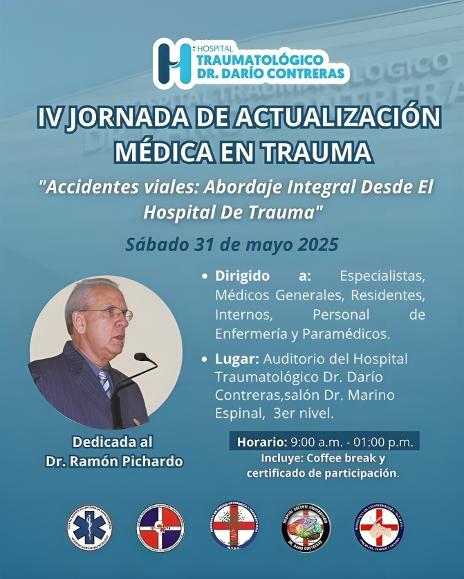 Santo Domingo. – El Hospital Traumatológico Dr. Darío Contreras invita a la IV Jornada de Actualización Médica en Trauma, bajo el tema «Accidentes viales: Abordaje integral desde el Hospital de Trauma», que se realizará el sábado 31 de mayo de 2025 en el Auditorio Dr. Marino Espinal (3er nivel) de esta institución, en horario de 9:00 a.m. a 1:00 p.m.