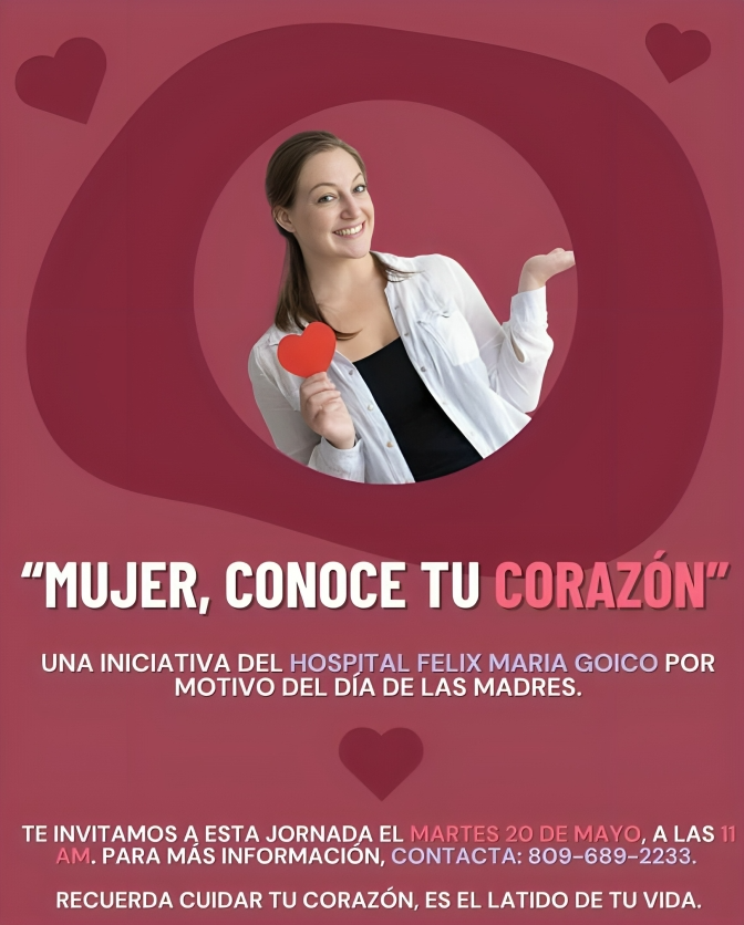 Santo Domingo. – En el marco de la conmemoración del Día de las Madres, el Hospital Dr. Félix María Goico realizará la jornada especial «Mujer, conoce tu corazón», un evento dirigido a todas las colaboradoras del centro de salud y mujeres en general que deseen evaluar su estado cardiovascular.