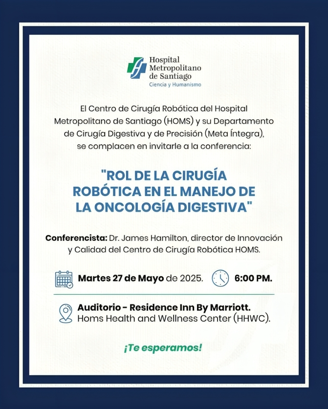 Santiago. – El Hospital Metropolitano de Santiago (HOMS), a través de su Departamento de Cirugía Digestiva y de Precisión, invita a profesionales de la salud, estudiantes y público interesado a la conferencia «Rol de la Cirugía Robótica en el Manejo de la Oncología Digestiva», que estará a cargo del destacado Dr. James Hamilton, reconocido cirujano digestivo, investigador y docente.