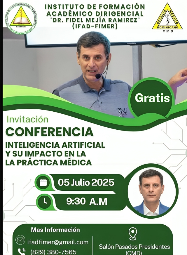Santo Domingo. – El Colegio Médico Dominicano (CMD) y el Instituto Académico Dirigencial «Dr. Fidel Mejía Ramírez» (IFAD-FIMER) invitan a participar en la conferencia titulada «Inteligencia Artificial y su Aplicación en la Práctica Médica», que será impartida por el Dr. Vahid Nouri Kandany.