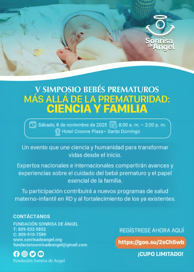Santo Domingo. – La Fundación Sonrisa de Ángel, Inc. invita a profesionales, estudiantes, familias y público interesado a participar en el V Simposio Bebé Prematuro “Más allá de la prematuridad: ciencia y familia”, que se llevará a cabo el sábado 8 de noviembre de 2025 en el Hotel Crowne Plaza de Santo Domingo, en horario de 8:00 a.m. a 2:00 p.m.