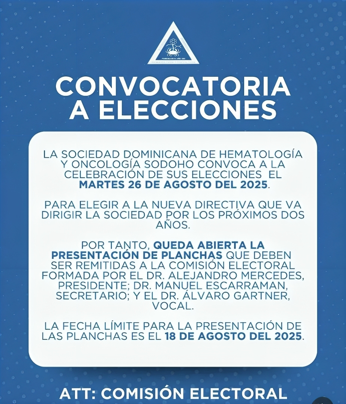 Santo Domingo. – La Sociedad Dominicana de Hematología y Oncología (SODOHO) hizo pública a través de su cuenta de Instagram @sodohord la convocatoria oficial para las elecciones que definirán su nueva directiva correspondiente al período 2025-2027. El proceso electoral se llevará a cabo el próximo martes 26 de agosto de 2025, según lo informado por la Comisión Electoral designada para este fin.