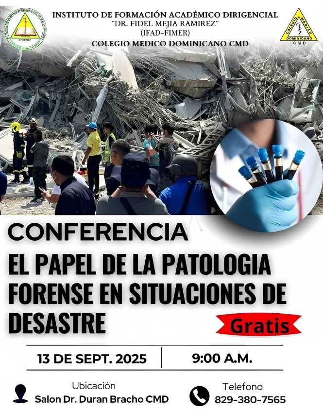 Santo Domingo. – El Instituto de Formación Académico Dirigencial «Dr. Fidel Mejía Ramírez» (IFAD-FIMER) y el Colegio Médico Dominicano (CMD) invitan a profesionales de la salud, estudiantes y público interesado a participar en la conferencia «El papel de la patología forense en situaciones de desastre». El evento se llevará a cabo el 13 de septiembre a las 9:00 a.m. en el Salón Dr. Durán Bracho del CMD, ubicado en la sede de la institución.