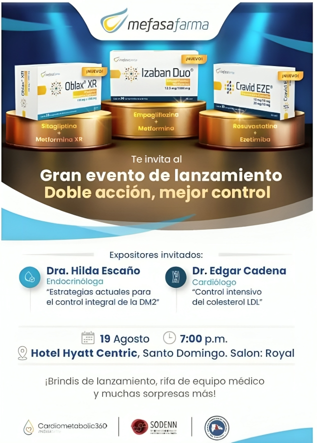 Santo Domingo. – Mefasa Farma realizará el lanzamiento de sus nuevas combinaciones terapéuticas bajo el lema “Doble acción, mejor control”, en un evento científico que contará con conferencias especializadas dirigidas a profesionales de la salud. La actividad se llevará a cabo hoy 19 de agosto a las 7:00 p.m. en el Salón Royal del Hotel Hyatt Centric en Santo Domingo.