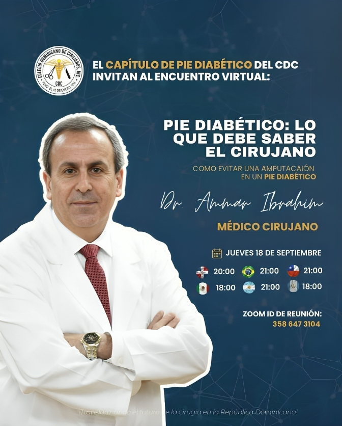 Santo Domingo. – El Capítulo de Pie Diabético del Colegio Dominicano de Cirujanos invita a participar en la conferencia virtual «Pie diabético: lo que debe saber el cirujano. Cómo evitar una amputación en un pie diabético», que será impartida por el Dr. Ammar Ibrahim, médico cirujano especializado en el tema.