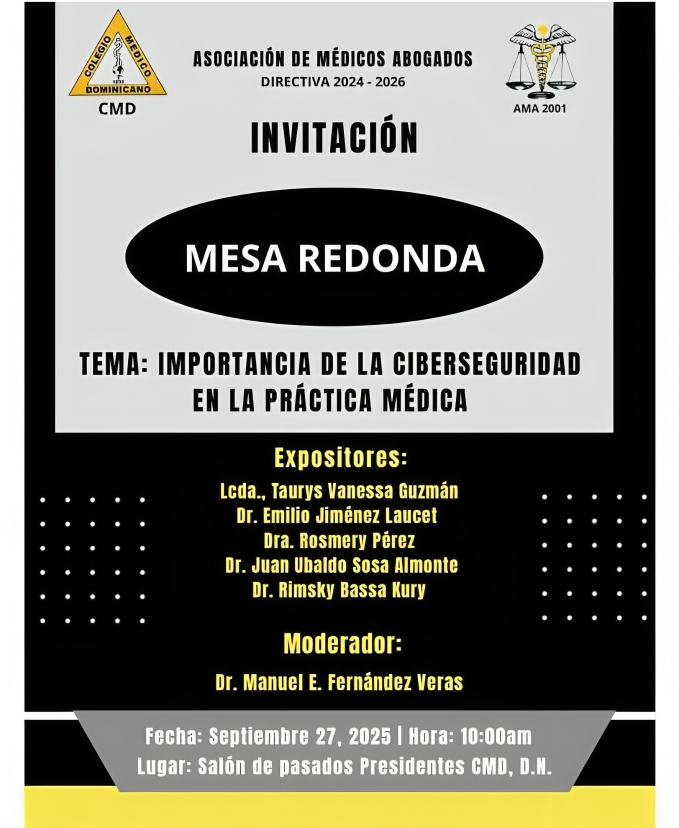 Santo Domingo. – La Asociación de Médicos Abogados (AMA), en coordinación con el Colegio Médico Dominicano (CMD), realizará este sábado 27 de septiembre de 2025 la mesa redonda «Importancia de la Ciberseguridad en la Práctica Médica», un evento dirigido a profesionales de la salud y el derecho que busca promover la protección de datos sensibles en el entorno digital.
