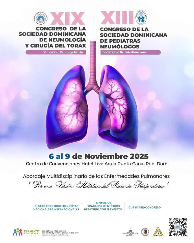 Santo Domingo. – La Sociedad Dominicana de Neumología y Cirugía del Tórax y la Sociedad Dominicana de Pediatras Neumólogos anunciaron la celebración del XIX Congreso de la Sociedad Dominicana de Neumología y Cirugía del Tórax y el XIII Congreso de la Sociedad Dominicana de Pediatras Neumólogos, que tendrá lugar del 6 al 9 de noviembre de 2025 en el Centro de Convenciones del Hotel Live Aqua, Punta Cana.
