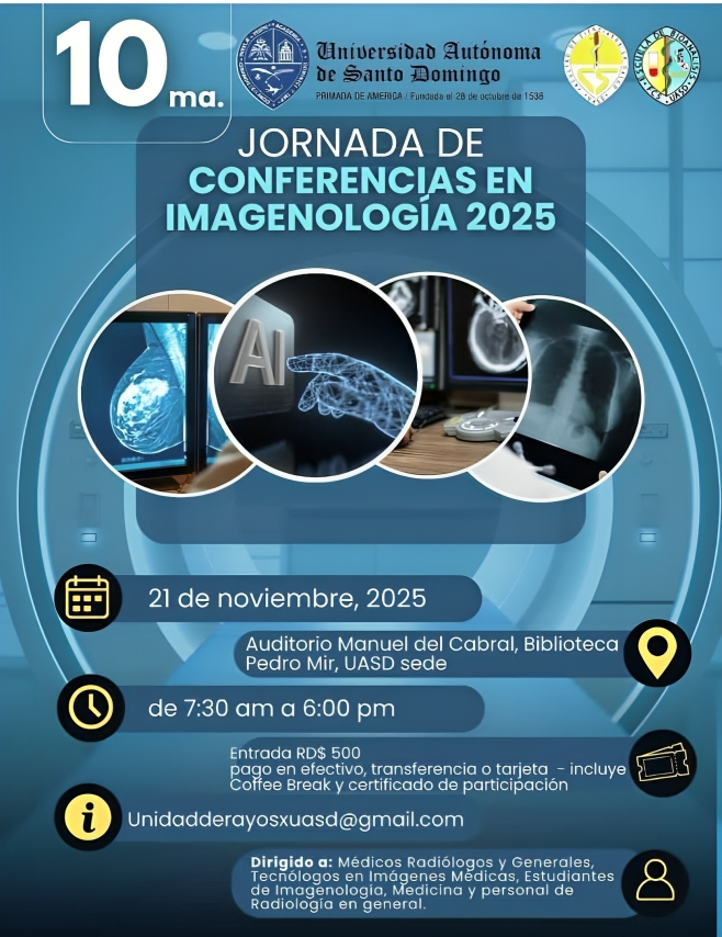 La jornada se llevará a cabo el viernes 21 de noviembre de 2025, en el Auditorio de la Biblioteca Pedro Mir, ubicado en la sede central de la UASD. Las actividades se desarrollarán desde las 8:00 de la mañana hasta las 6:00 de la tarde. Está dirigido a Médicos Radiólogos y Generales, Tecnólogos en Imágenes Médicas, Estudiantes de Imagenología y Medicina, así como a todo el personal de Radiología en general.