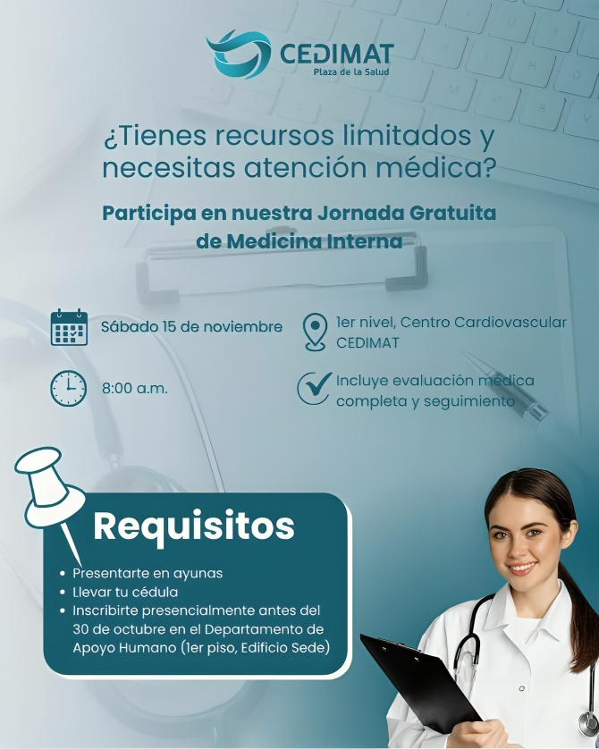 Santo Domingo. – Los Centros de Diagnóstico y Medicina Avanzada y de Conferencias Médicas y Telemedicina (CEDIMAT) invitan a participar en una Jornada Gratuita de Medicina Interna programada para el sábado 15 de noviembre, dirigida especialmente a personas con recursos limitados.