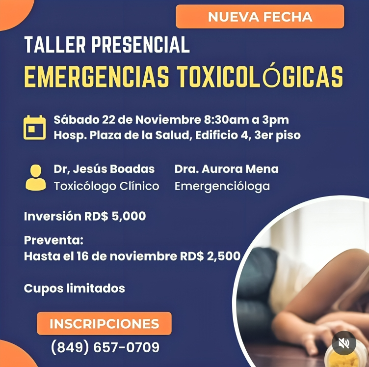 Santo Domingo. – El destacado toxicólogo clínico, doctor Jesús Boada, en conjunto con la doctora Aurora Mena, emergencióloga, invitan a los profesionales de la salud a participar en el Taller de Emergencias Toxicológicas. La actividad, que había sido programada inicialmente para el 25 de octubre, fue reprogramada debido a las condiciones climáticas recientes y se llevará a cabo el sábado 22 de noviembre en el Hospital General Plaza de la Salud, en un horario de 8:30 de la mañana a 3:00 de la tarde.