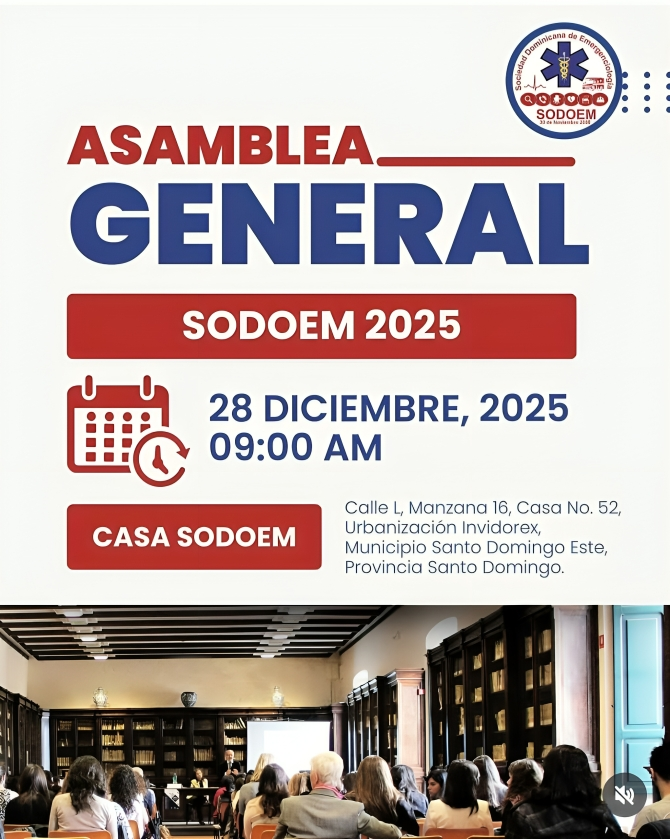 Santo Domingo. – La Sociedad Dominicana de Emergenciología (SODOEM) extiende una cordial invitación a todos sus miembros para participar en su Asamblea General ordinaria, la cual se llevará a cabo el domingo 28 de diciembre de 2025 a las 9:00 de la mañana. La cita tendrá lugar en la sede institucional de la Sociedad, ubicada en la Calle L, Manzana 16, Casa No. 52, de la Urbanización Invidorex, en Santo Domingo Este.