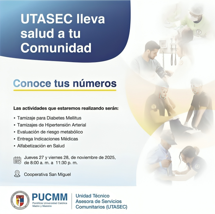 Santo Domingo. – La Unidad Técnico Asesora de Servicios Comunitarios de la Pontificia Universidad Católica Madre y Maestra (UTASEC-PUCMM) continúa llevando servicios de salud preventiva a las comunidades, esta vez con una jornada de tamizajes gratuitos programada para los días jueves 27 y viernes 28 de noviembre de 2025 en la Cooperativa San Miguel.