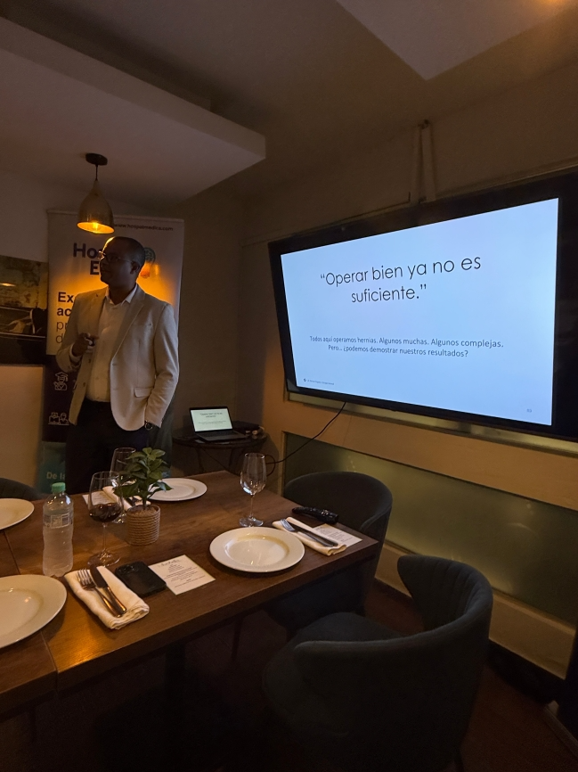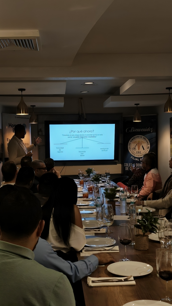 El encuentro, realizado en el restaurante La Forchetta de Santo Domingo, reunió a una amplia comunidad de profesionales de la salud interesados en la transformación digital del quirófano y en la importancia de la recolección de datos estructurados como herramienta para mejorar los resultados quirúrgicos. Durante su intervención, el Dr. Peguero —especialista en cirugía general, pared abdominal y hernias— destacó la necesidad de un cambio de paradigma en la práctica quirúrgica moderna. “Estamos en una etapa donde el estándor ya no es solo operar, sino poder demostrar resultados clínicos sólidos”, afirmó ante sus colegas.