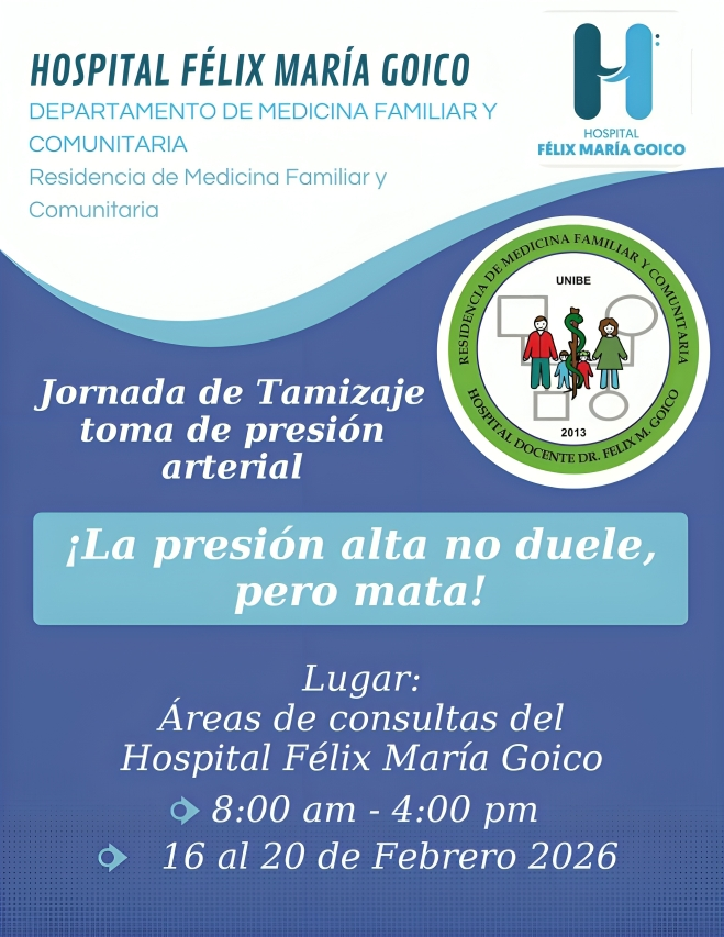 Santo Domingo. – El Hospital Docente Dr. Félix María Goico, a través de su Residencia de Medicina Familiar y Comunitaria, informa la realización de una Jornada de Tamizaje de Presión Arterial, a efectuarse del 16 al 20 de febrero de 2026, en las áreas de consultas del centro de salud.