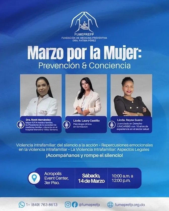 Santo Domingo. – En el marco de la conmemoración del Día Internacional de la Mujer, la Fundación de Medicina Preventiva Dra. Fátima Pérez (FUMEPREFPP) realizará el taller «Marzo por la Mujer: Prevención y Conciencia», una actividad orientada a fomentar la educación, la reflexión y la sensibilización sobre la violencia intrafamiliar.
