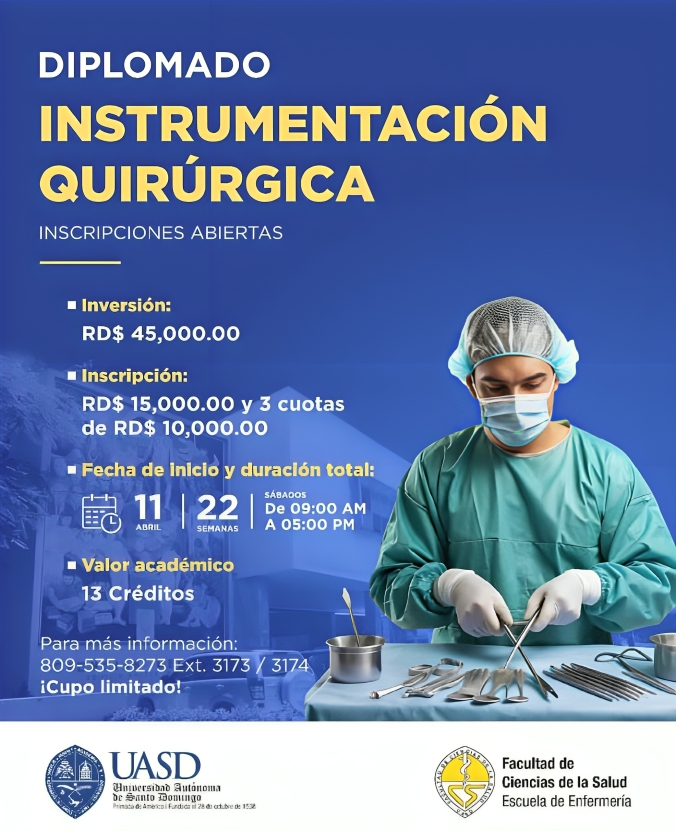 Santo Domingo. – La Universidad Autónoma de Santo Domingo (UASD), a través de la Facultad de Ciencias de la Salud y la Escuela de Enfermería, invita a participar en el Diplomado de Instrumentación Quirúrgica, un programa de formación especializada diseñado para fortalecer las competencias técnicas y profesionales en el área quirúrgica.