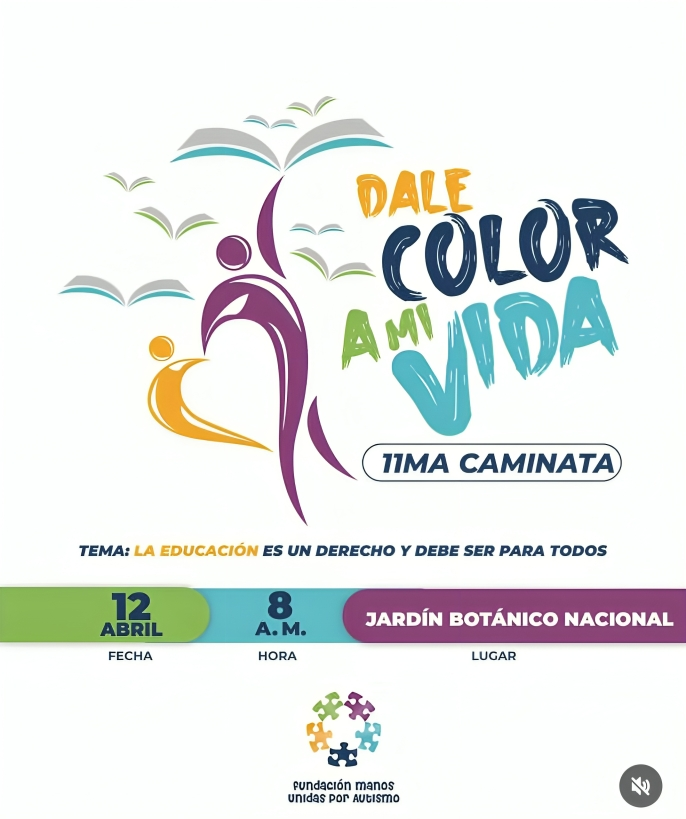Santo Domingo. – La Fundación Manos Unidas por Autismo invita a participar en la caminata “Dale Color a mi Vida”, una jornada de concienciación y sensibilización social que se llevará a cabo el sábado 12 de abril a las 8:00 de la mañana en el Jardín Botánico Nacional.