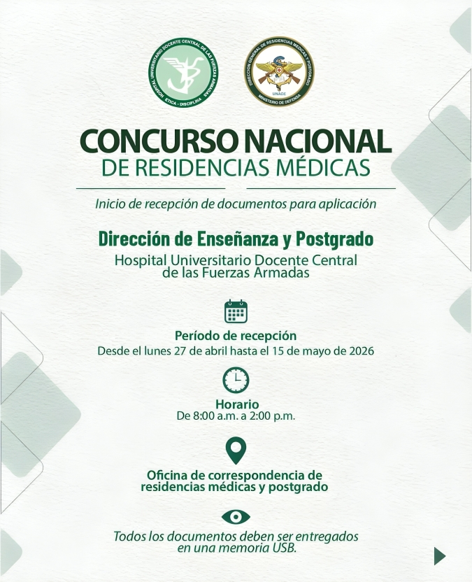 En ese sentido, informó que la recepción de documentos para la aplicación a las residencias médicas se realizará desde el lunes 27 de abril hasta el viernes 15 de mayo, en la Oficina de Correspondencia de Residencias Médicas y Postgrados del Hospital Universitario Docente Central de las Fuerzas Armadas, en horario de 8:00 a.m. a 2:00 p.m.